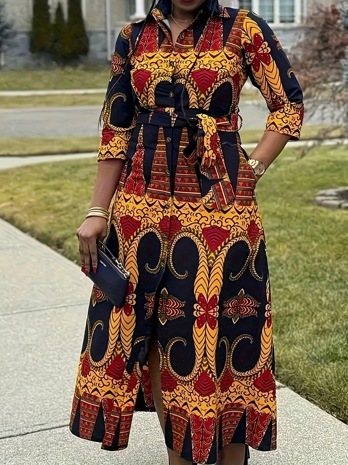 Chic Geometric Pattern Midi Dress with Waist Belt & Structured Collar